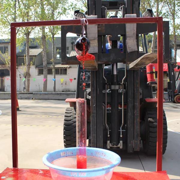 叉車倒紅酒,叉車貨叉尖端裝置一根前端稍彎曲鐵針,用鐵針頂住紅酒瓶底部,參賽選手需要駕駛叉車將紅酒平穩(wěn)倒入杯中。主要比拼選手掌握叉車的平穩(wěn)性和精細(xì)度。